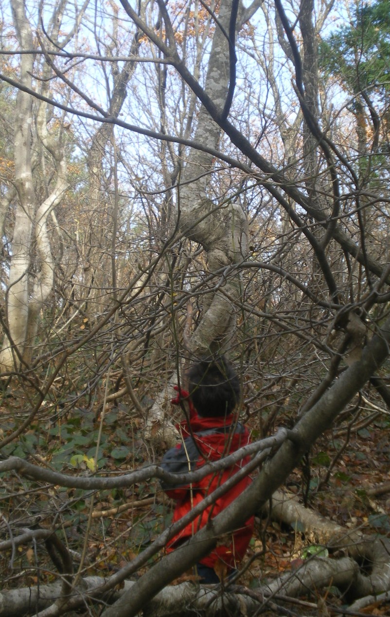 枯れ木の枝でシーソー遊び。行くまでものすごく嫌がっていたけど、遊び始めると手のひらを返したようにものすごく楽しそうだった。